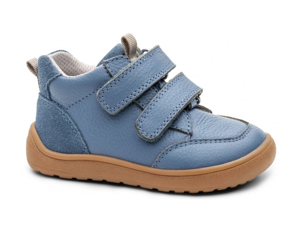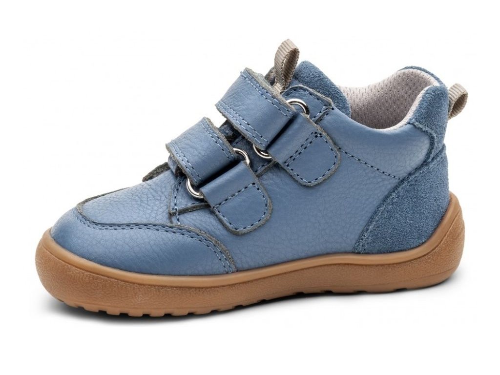 Chlapčenské prechodné barefoot topánky Alan Blue v nadčasovej modrej farbe sú vyrobené z prémiovej hladkej kože. Ponúkajú dokonalý súlad medzi voľnosťou a stabilitou vďaka priestrannej špičke, nulovému dropu a čiastočne spevnenému opätku, ktorý udržuje nohu v správnom postavení. Ohybná podrážka s jemným dezénom a praktické zapínanie na suchý zips z nich robia ideálnu voľbu na každodenné nosenie.