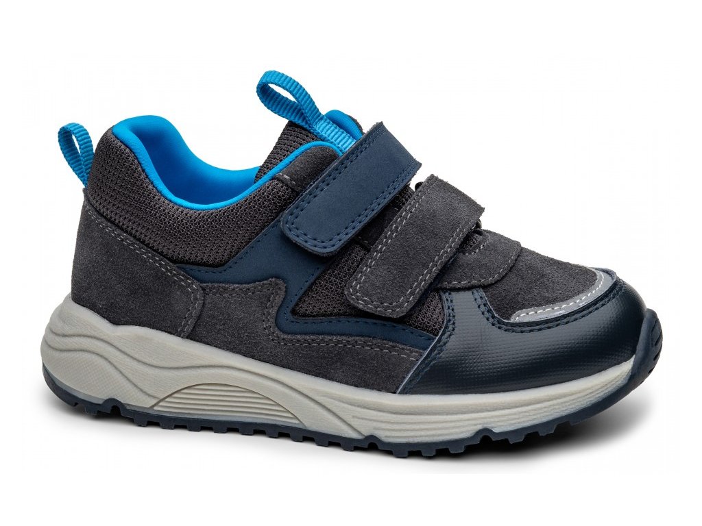 Moderné chlapčenské tenisky v štýlovej šedej farbe s modrými detailmi, ideálne na jarné a jesenné vychádzky. Kombinácia brúsenej a hladkej umývateľnej kože zaručuje odolnosť a jednoduchú údržbu. Vďaka pevnému opätku, podpore klenby a zvýšenej protišmykovej podošve poskytujú nohám potrebnú stabilitu a ochranu pri každom kroku v meste i na ihrisku.