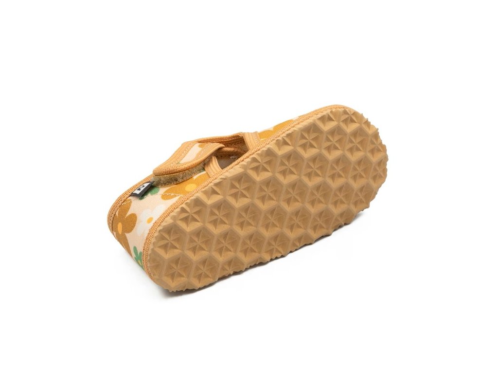 Detská domáca obuv zo 100% bavlny a prírodnej podšívkovej ECO kože s prvkami tzv. barefoot obuvi - výrazne flexibilnou stielkou a podošvou s nulovým dropom (rozdiel medzi výškou päty a špice oproti podložke je nula). Tento typ obuvi je vhodný do interiéru, ideálne na mäkké resp. 3D povrchy, napr. koberec, hracie podložky a pod., krátkodobo aj na hladké pevné povrchy, napr. plávajúcu podlahu, optimálne pri striedaní mäkkých a pevných povrchov.