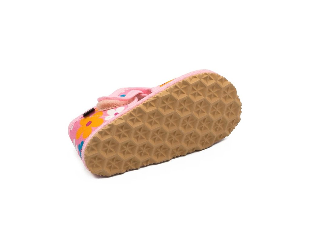 Detská domáca obuv zo 100% bavlny a prírodnej podšívkovej ECO kože s prvkami tzv. barefoot obuvi - výrazne flexibilnou stielkou a podošvou s nulovým dropom (rozdiel medzi výškou päty a špice oproti podložke je nula). Tento typ obuvi je vhodný do interiéru, ideálne na mäkké resp. 3D povrchy, napr. koberec, hracie podložky a pod., krátkodobo aj na hladké pevné povrchy, napr. plávajúcu podlahu, optimálne pri striedaní mäkkých a pevných povrchov.